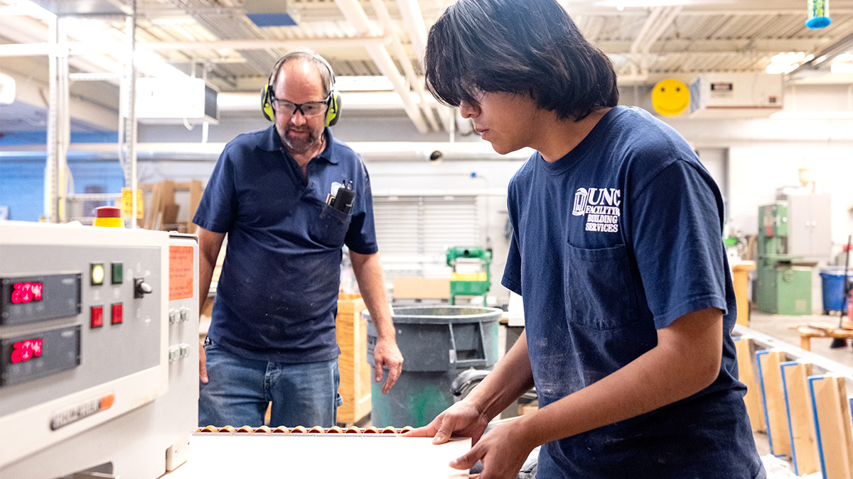 One notable example is the Finance and Operations Apprenticeship Program at UNC-Chapel Hill. Alex Escobedo, a participant in the program, is on his way to a career as a licensed carpenter. Escobedo is one of three Facilities Services apprentices — two in carpentry and one in life safety — helping to pilot the program. Participants learn a valuable trade from experienced Carolina staff members while earning a salary and benefits from the University and gaining knowledge about their field through part-time studies at local community colleges. Each apprenticeship lasts from two to four years, depending on the skills being learned, and is registered with the state of North Carolina and the U.S. Department of Labor. Once Escobedo and his peers successfully complete their apprenticeships, they can move into a journey-level position at Carolina.