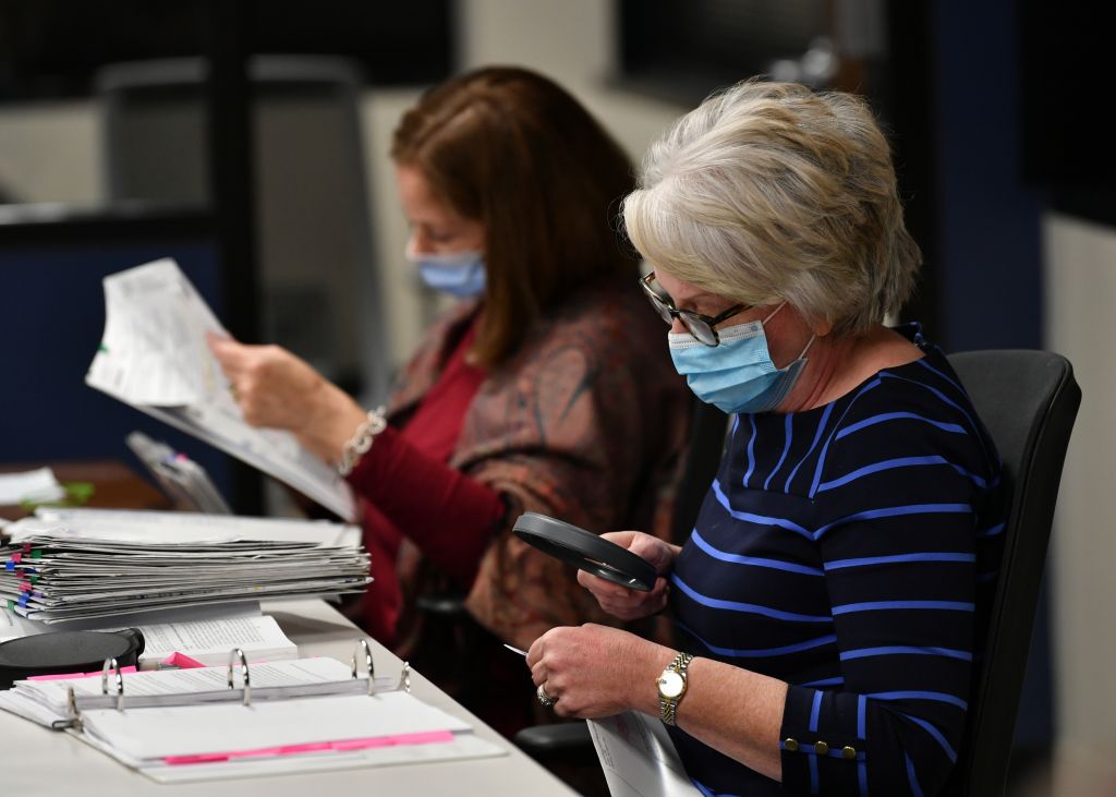 Officials count ballots of 2020 United States Presidential Election at the Mecklenburg County Board of Elections office in Charlotte, North Carolina, United States on November 06, 2020. Photo by Peter Zay/Getty Images.