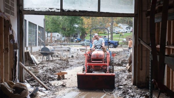 Caleb Lawson uses an excavator to pull a thick layer of mud out from the Lawson Design Shop in the aftermath of flooding caused by the remnants of Hurricane Helene. Stephen J Heaslip, Stephen J Heaslip-USA TODAY