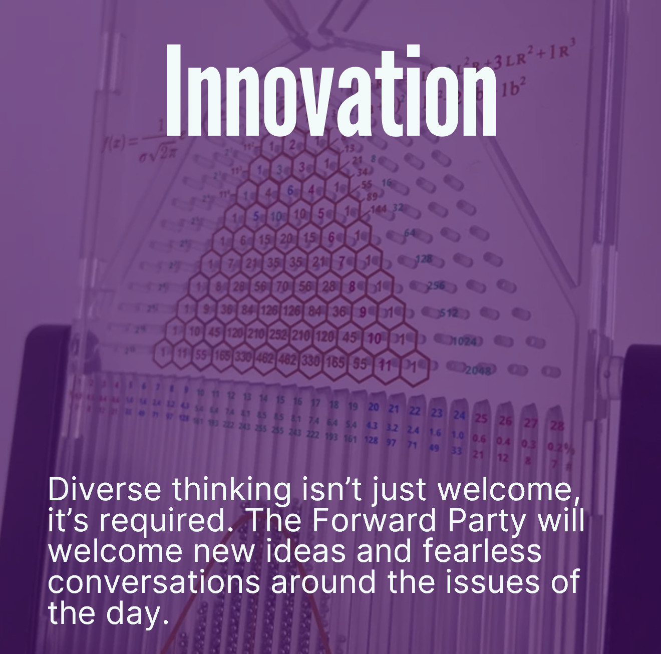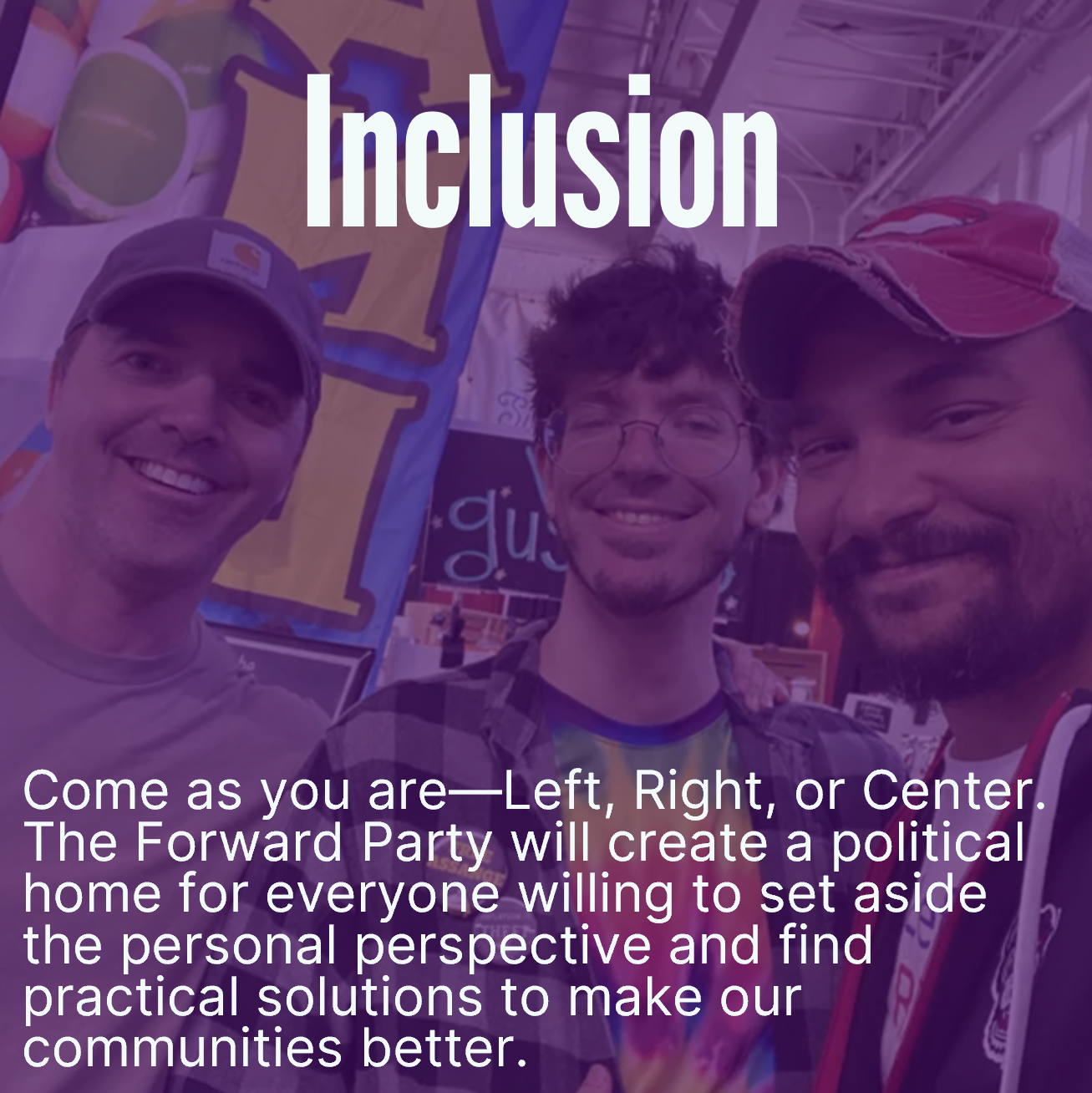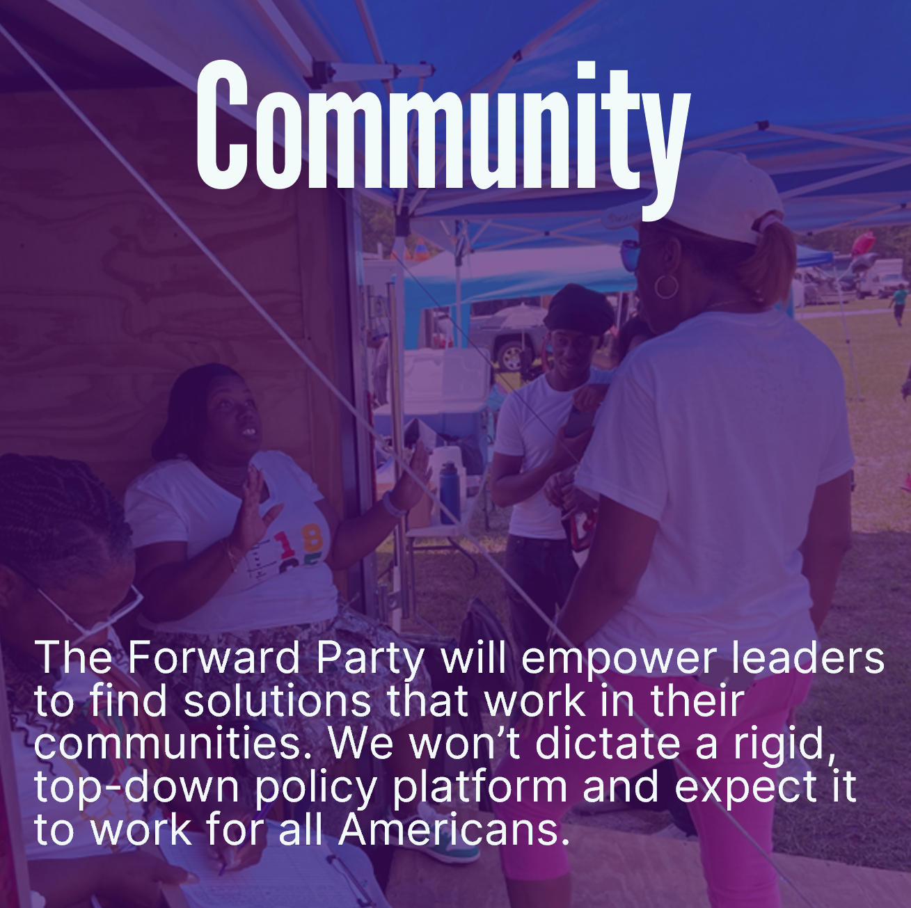 The Forward Party stands for doing, not dividing. That means rejecting political extremes and working together to take real action on every important issue for the unrepresented majority in American politics. We're not building a copy of the current parties, which are dragging our country backwards. We're moving American politics forward, with a party focused on innovative, collaborative, and common-sense solutions that work for the communities.