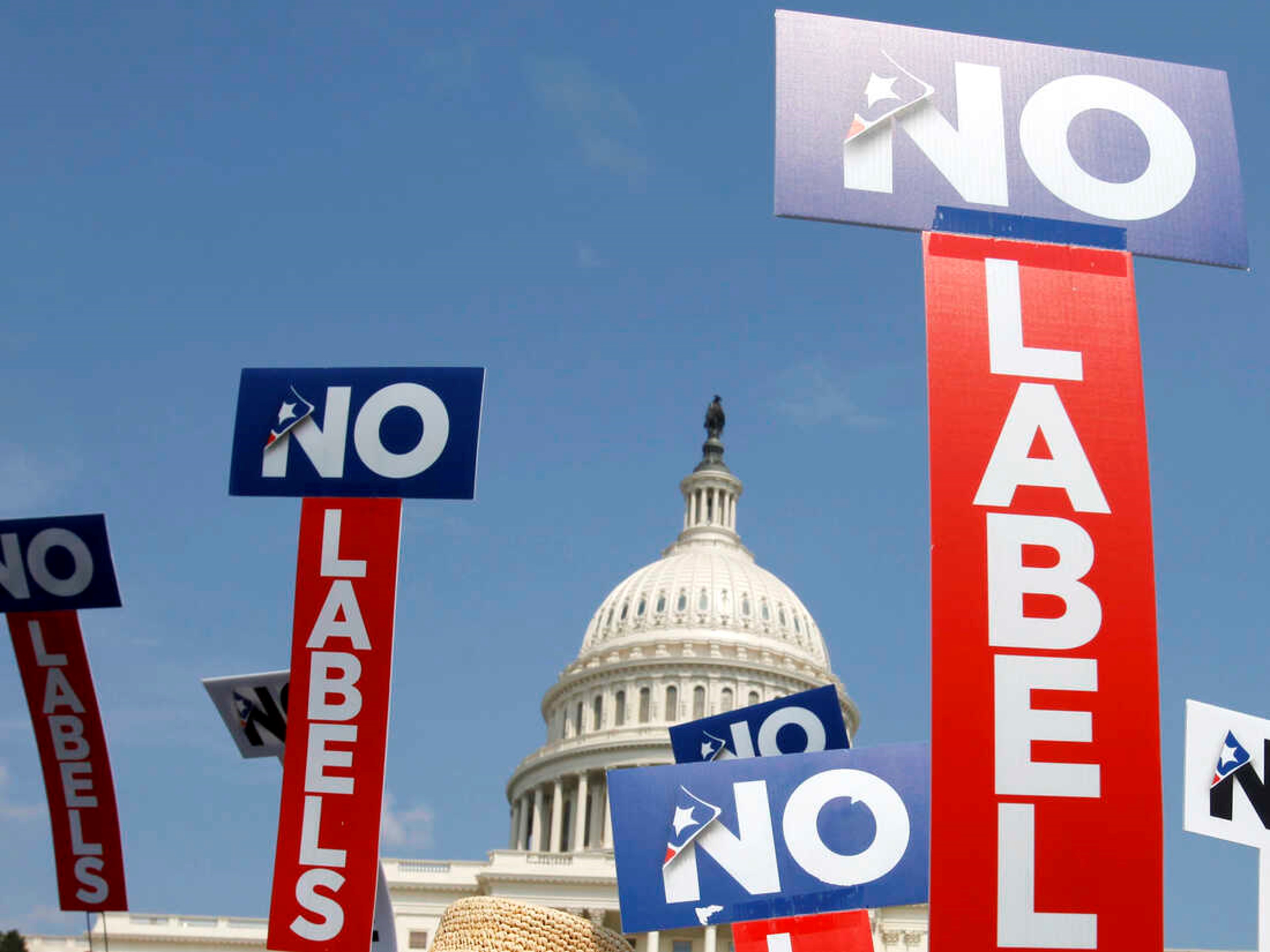 People with the group No Labels hold signs during a rally on Capitol Hill in Washington, D.C., on July 18, 2011. Jacquelyn Martin/AP